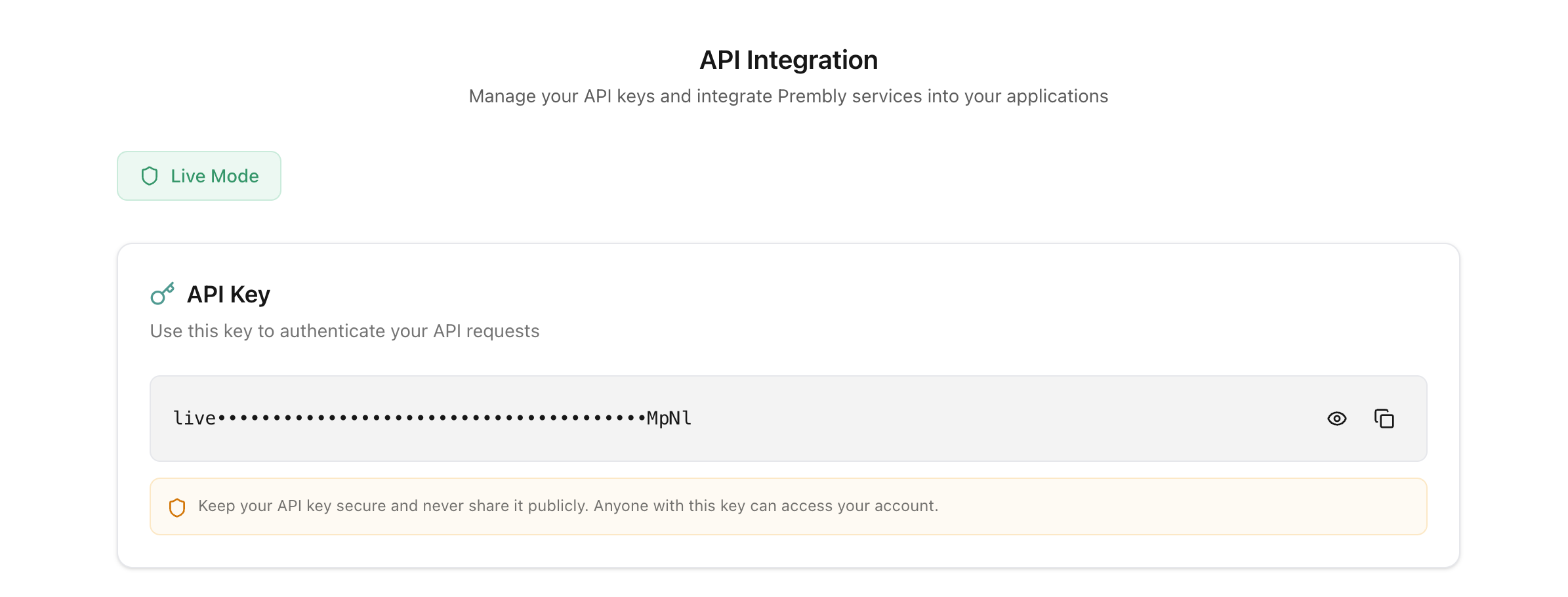 Prembly’s authentication mechanism relies on the Secret Key (API Key) used when making API calls from your server.